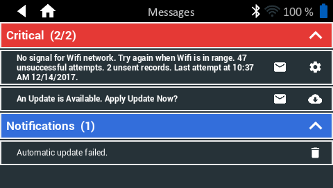 You are also alerted when a software update is available through the Messages app on the Main Screen. In the example below, there are two critical messages. One of them is alerting the user that a software update is available. To proceed with the software update from the Messages screen, tap on the Cloud icon.
