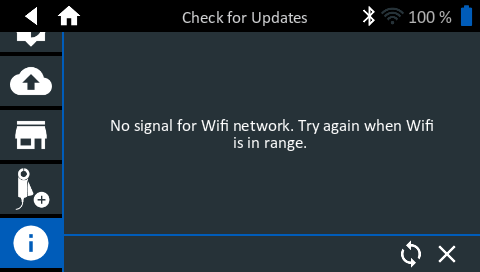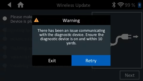 A Warning screen will appear if the Controller and Tester Pod are not within Bluetooth range of each other (~30 feet) during the software update process.