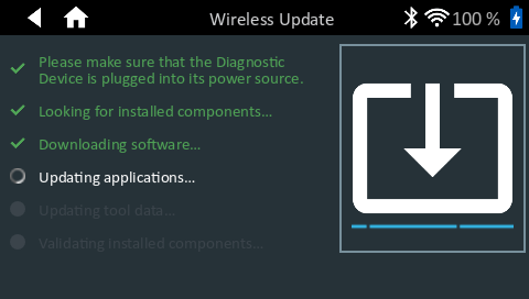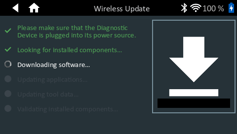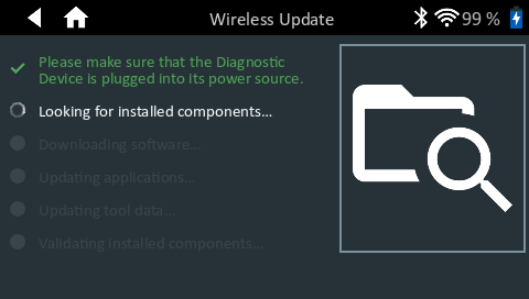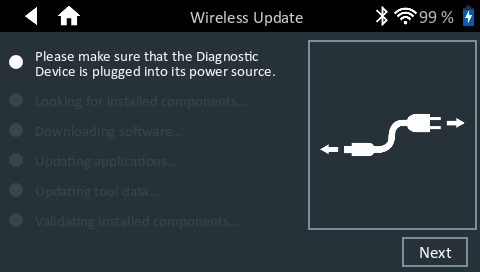 Not pictured, you will get a Warning message if the internal AA batteries inside the Tester Pod are too low telling you to replace the batteries before you can continue with the software update.